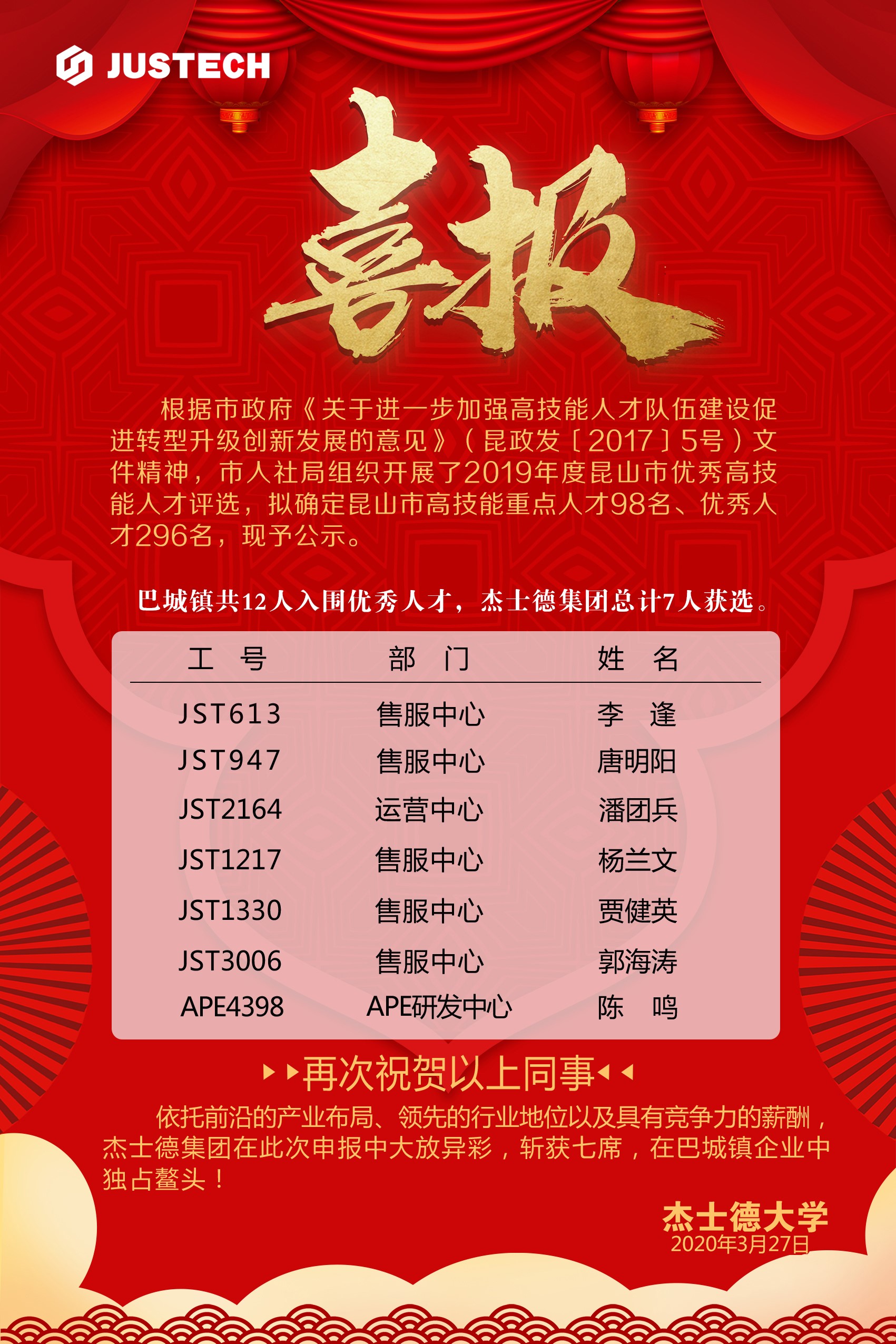 杰士德集團7名員工入選2019年昆山市高技能人才榜