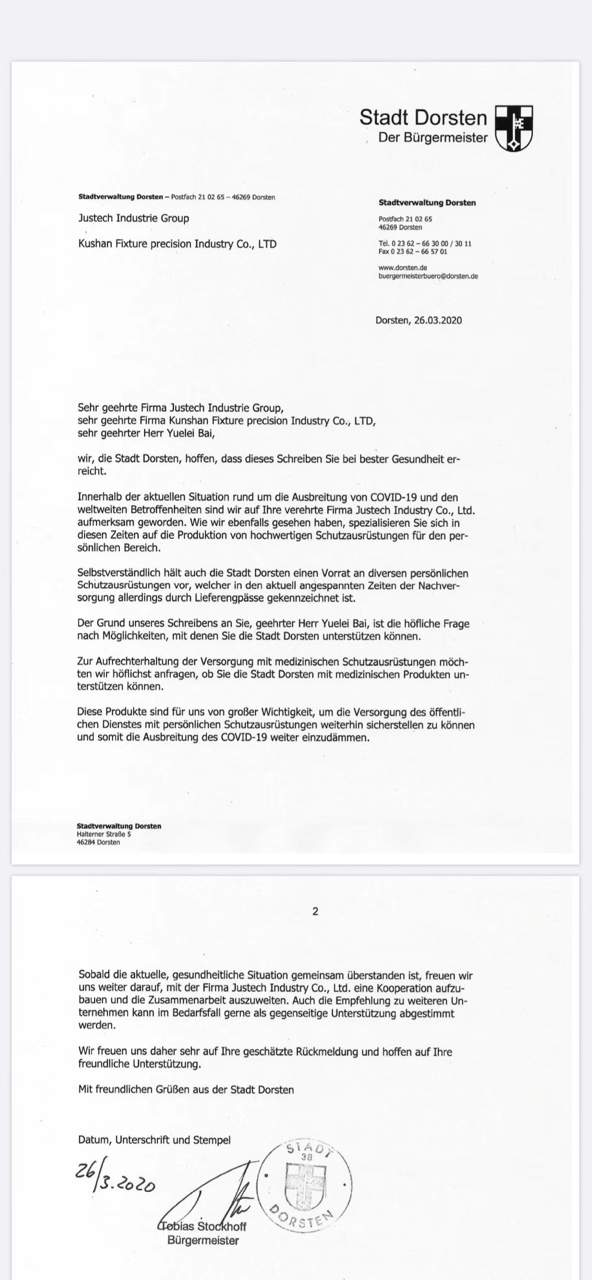 2020年3月26日,德國Dorsten市市長致信江蘇杰士德集團旗下菲克馳精密制造有限公司總經(jīng)理Frank,