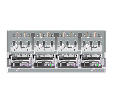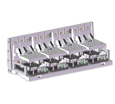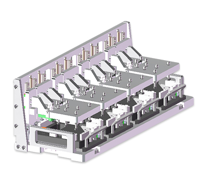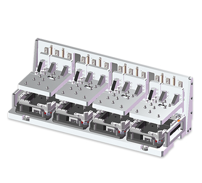 載具底座承載四個膠水尚未固化的產(chǎn)品,保壓模塊下壓固定產(chǎn)品,隨后載具流入高溫固化爐完成膠水固化。