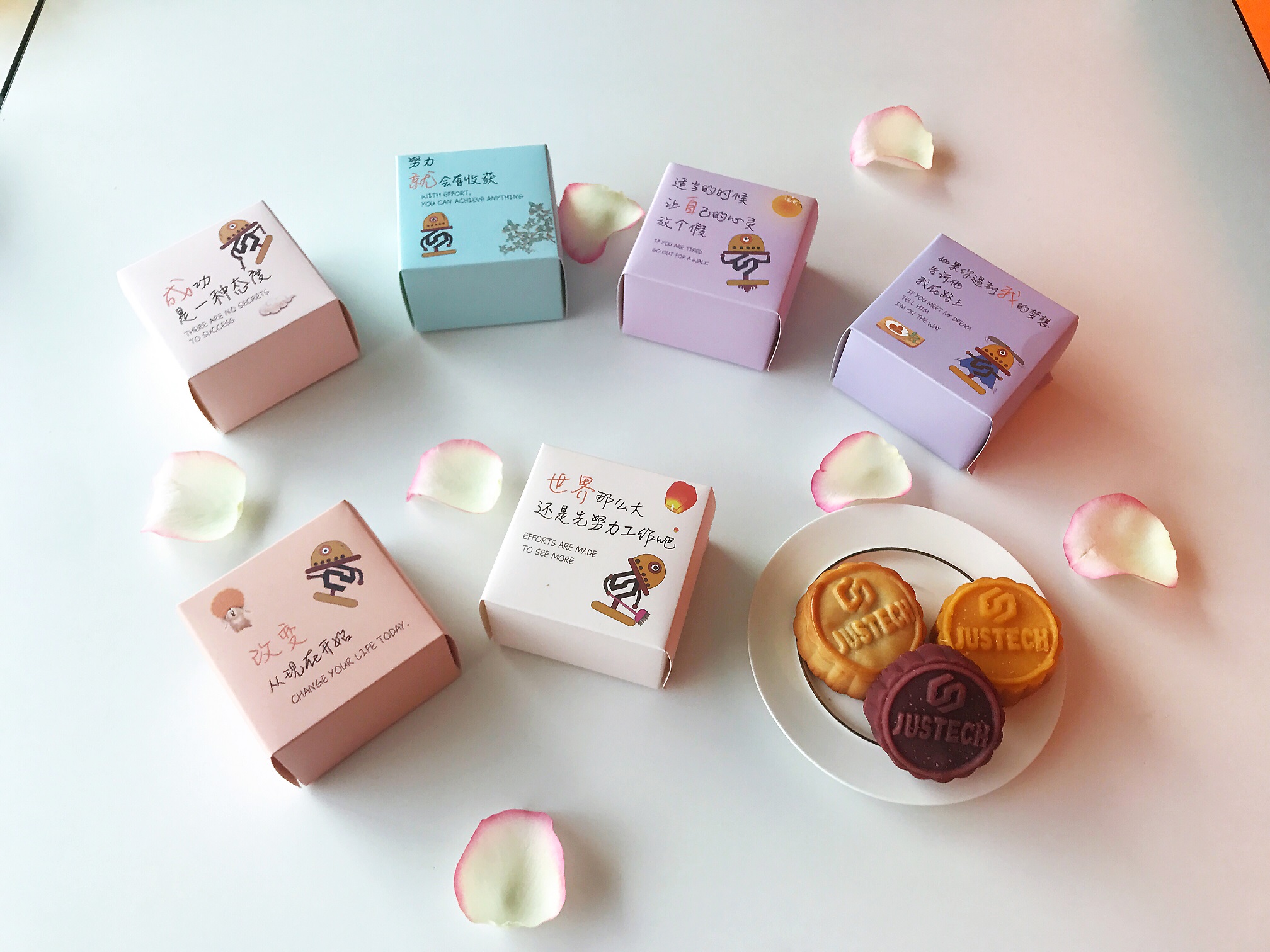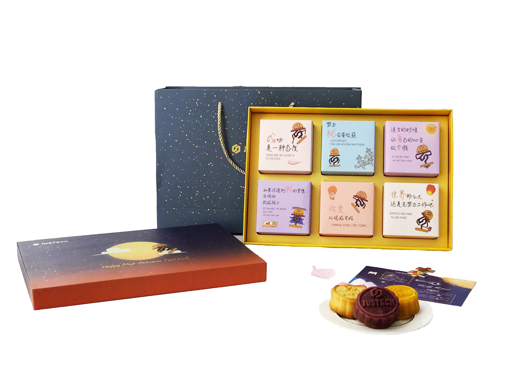 6個(gè)月餅小內(nèi)盒也暗藏著設(shè)計(jì)者的“小心機(jī)”,我們以杰士德logo為原型,自動(dòng)化行業(yè)為設(shè)計(jì)背景,設(shè)計(jì)出多款logo卡通機(jī)器人,以妙趣的“人生啟示錄”方式結(jié)合“半藏頭詩(shī)”手法巧妙的表達(dá)出了:成就自我,改變世界的JUSTECH企業(yè)使命。6個(gè)不同的logo卡通機(jī)器人,配以中秋元素輔助,使得整個(gè)包裝設(shè)計(jì)淡雅中不失豐富,沿襲傳統(tǒng)卻又不落俗套,頗具內(nèi)涵性、趣味性及文化性。