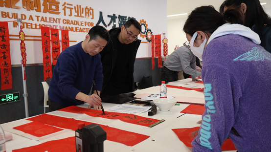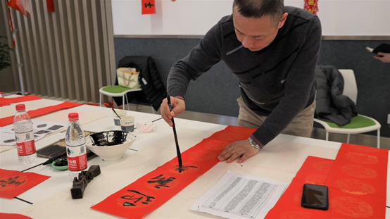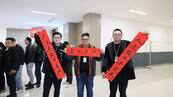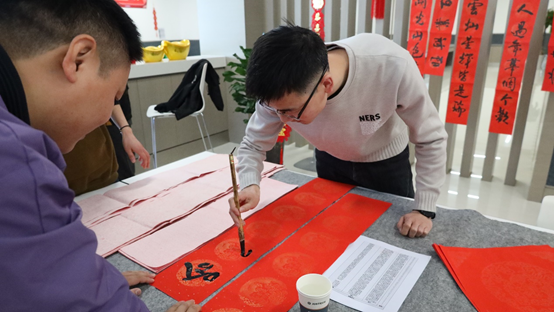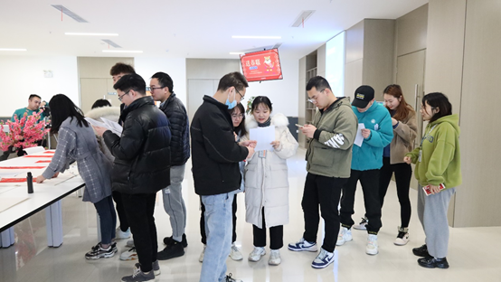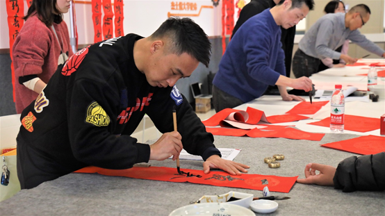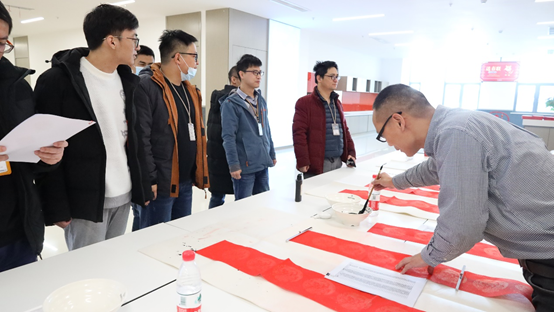 活動(dòng)現(xiàn)場上年味濃郁、墨香四溢。來自各子公司、各部門的同事們也紛紛挑好了自己心儀的對(duì)聯(lián)詞,加入到了領(lǐng)春聯(lián)的隊(duì)列當(dāng)中。大家熙熙攘攘圍繞在四周,喜悅之情溢于言表,書寫的春聯(lián)更是供不應(yīng)求。書法家們疾筆揮毫,圍觀群眾里也不斷發(fā)出贊許之聲。情到濃時(shí),更有才華橫溢的小伙伴加入到了寫春聯(lián)的隊(duì)伍里去。