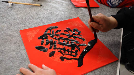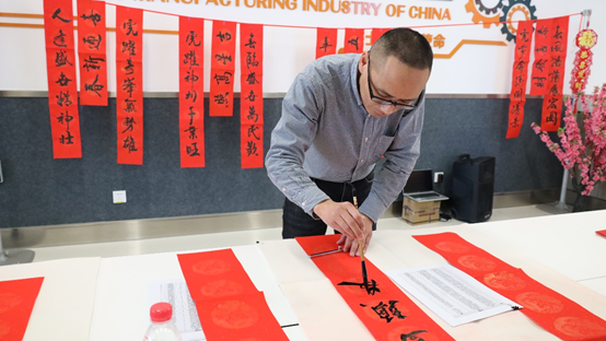 寬大的案臺(tái)前,特邀的書法家和集團(tuán)內(nèi)書法愛好者神情專注,將毛筆蘸滿墨汁,用或豐實(shí)厚重,或粗獷深沉,或飄逸瀟灑的筆觸,在大紅的對(duì)聯(lián)紙上滿懷熱情地寫下一副副飽含美好祝福的春聯(lián)。