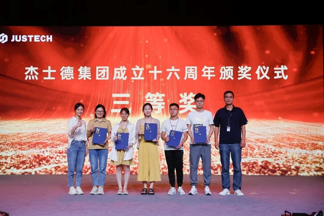 來(lái)自艾派科技研發(fā)中心的陳總監(jiān)則以一曲深情縈繞的《知否知否》,在晚會(huì)的尾聲展示了杰士德管理者團(tuán)隊(duì)的多姿多彩,同臺(tái)獻(xiàn)藝,上下齊心,未來(lái)更可期。在晚會(huì)中,集團(tuán)為在本次卓越班培訓(xùn)組織及實(shí)施工作中,保障培訓(xùn)工作順利展開(kāi)的眾多講師與支援人員分別頒發(fā)了“最美講師”“最美志愿者”獎(jiǎng)項(xiàng)。同時(shí),借由大學(xué)生畢業(yè)晚會(huì)這一隆重特別的場(chǎng)合,集團(tuán)還為十六周年獻(xiàn)禮活動(dòng)的獲獎(jiǎng)部門(mén)、個(gè)人及認(rèn)證合格的集團(tuán)內(nèi)部講師分別頒發(fā)了獲獎(jiǎng)證書(shū)及資格證書(shū)。