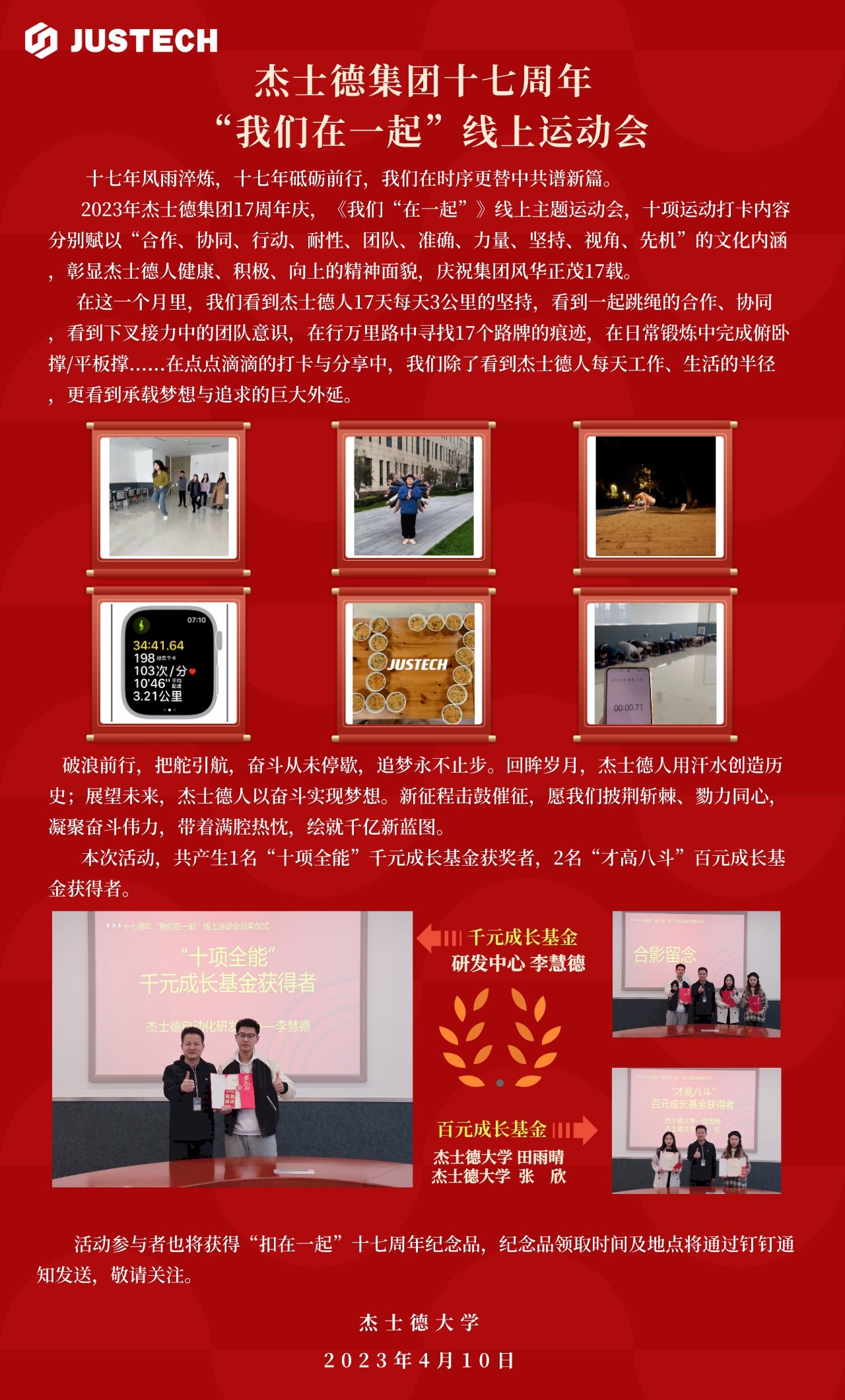 已經(jīng)過(guò)去的17周年“我們?cè)谝黄稹本€上運(yùn)動(dòng)會(huì),將十項(xiàng)運(yùn)動(dòng)打卡內(nèi)容分別賦以“合作、協(xié)同、行動(dòng)、耐性、團(tuán)隊(duì)、準(zhǔn)確、力量、堅(jiān)持、視角、先機(jī)”的文化內(nèi)涵,彰顯杰士德人健康、積極、向上的精神面貌,慶祝集團(tuán)風(fēng)華正茂17載。