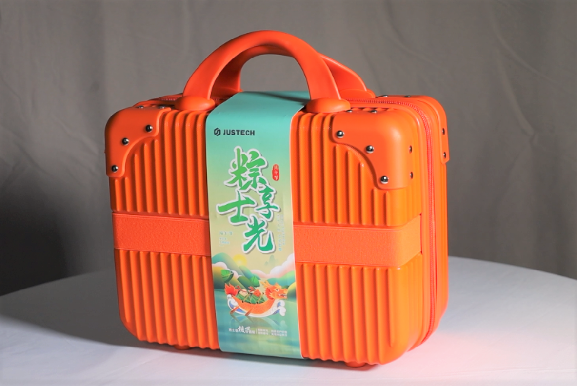 此次端午禮品外包裝一改往年的禮盒包裝,大膽創(chuàng)新采用了手提式行李箱設(shè)計(jì),箱體采用防刮耐磨的ABS材質(zhì),方便收納各類衣物和化妝品等,鉚釘加固防撞包角,箱體背部附帶強(qiáng)力背帶,方便外出放置于旅行箱頂部。整體箱面顏色采用鮮艷的杰士德橙,搭配端午的青綠色腰封,充滿溫暖和活力。輕松隨行,卸下負(fù)擔(dān),才能滿載而歸。